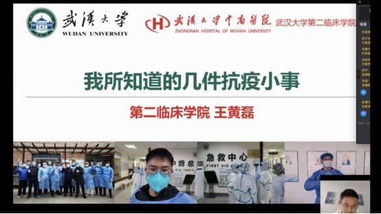 网络团校第三讲邀请到了永利集团304am登录第二临床学院的王黄磊老师开展以“讲好抗疫故事,彰显青春力量”为主题的讲座。疫情发生以来,永利集团304am登录涌现出一批英雄的医护人员和志愿者,成为广大青年团员的身边榜样。为帮助青年们更真实地了解武大人在抗击疫情中所展现的精神面貌,王黄磊老师介绍了他所知道的几件抗疫小事。为我们简单介绍了新冠肺炎和他所支援的武汉市第七医院以及他的一些想法。